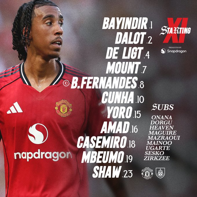 Manchester United: Altay Bayindir, Leny Yoro (Mazraoui 85′), Matthijs de Ligt, Luke Shaw, Amad Diallo, Casemiro (Sesko 72′), Bruno Fernandes, Diogo Dalot, Bryan Mbeumo, Mason Mount (Mainoo 46′), Matheus Cunha (31′).