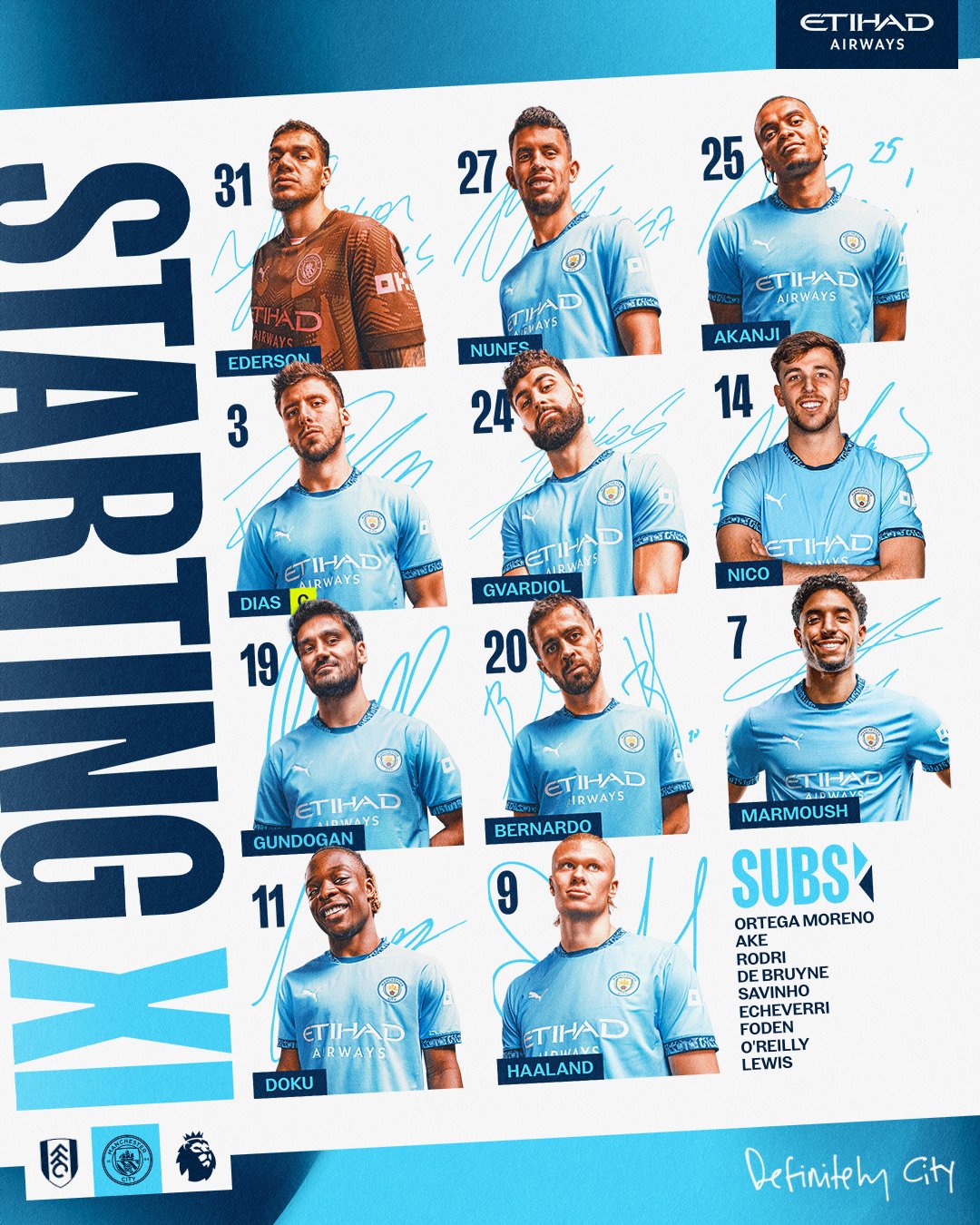 Man City: Ederson, Matheus Nunes, Manuel Akanji, Ruben Dias, Josko Gvardiol, Nico Gonzalez, Ilkay Gundogan (De Bruyne 85′), Bernardo Silva, Omar Marmoush (Foden 82′), Jeremy Doku (Savinho 74′), Erling Haaland (Echeverri 85′).